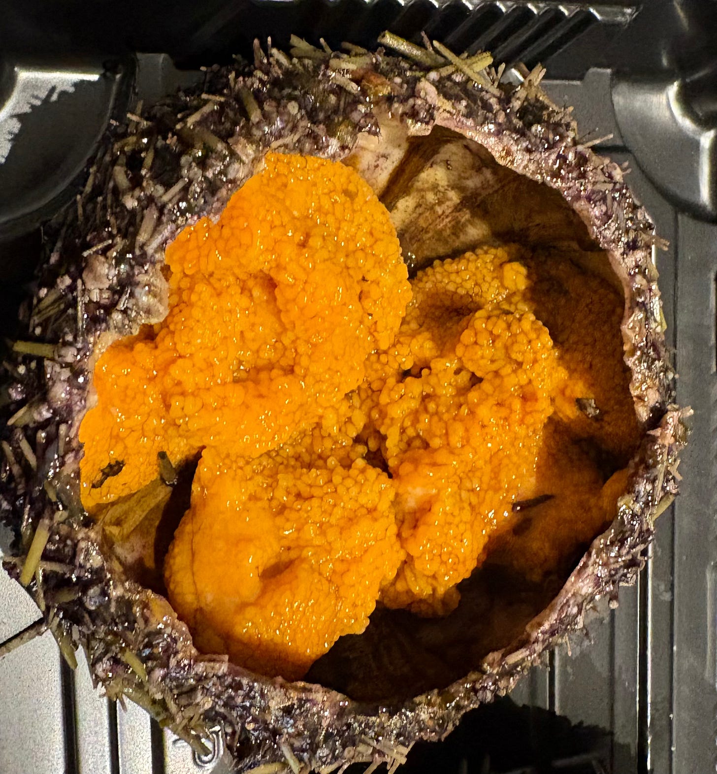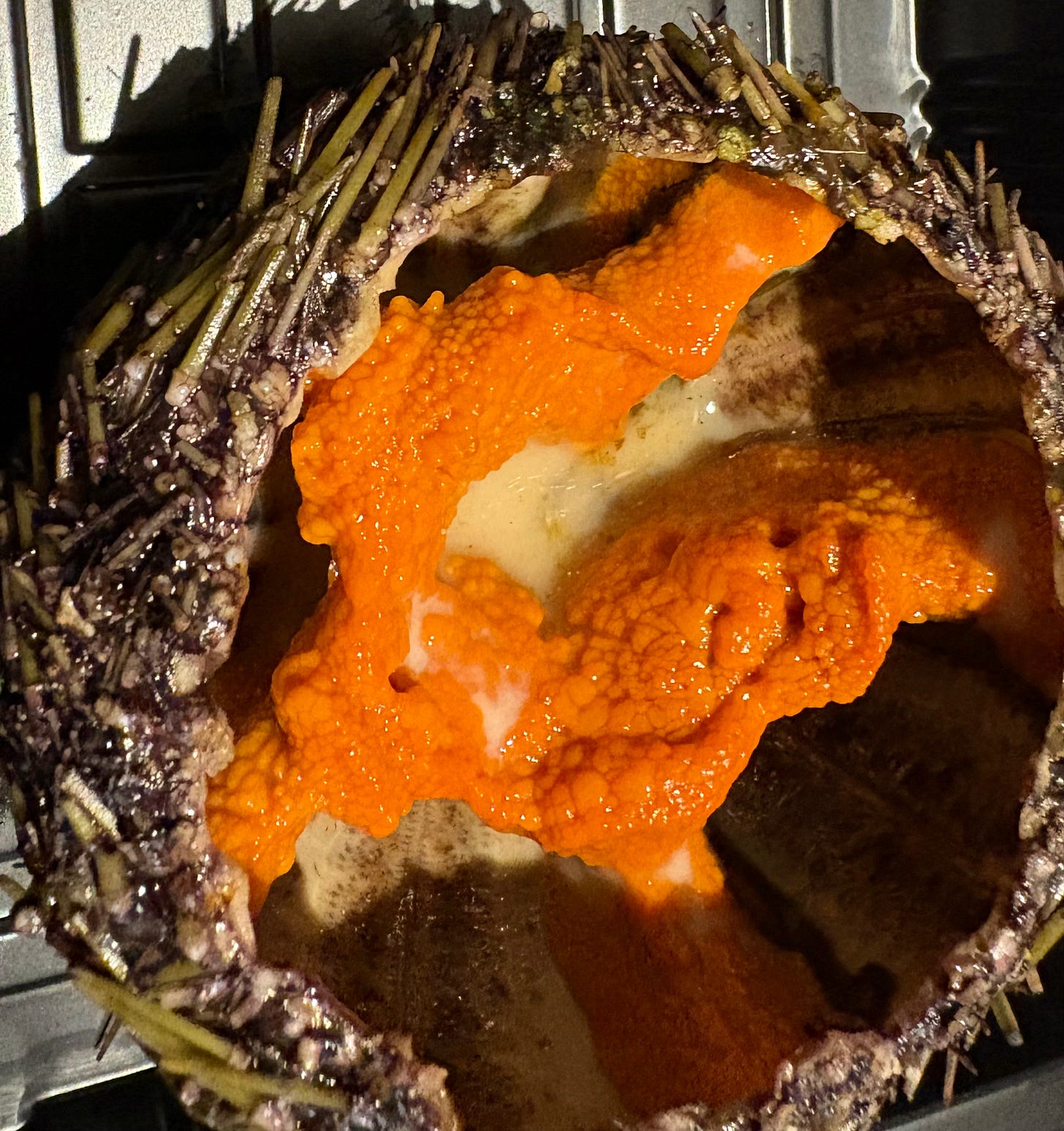 I wanted to see if I could tell the difference between male and female sea urchins. I think the male was this darker orange one here, and had slightly stronger brine and metal tang. The lighter yellow being more female roe was slightly more buttery, with no metal tang at all. But if anyone eats a lot or knows, let me know.