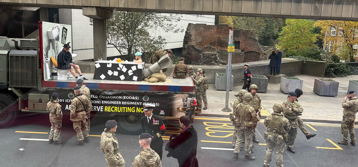 Other participants include bands and members of "privileged regiments" of the City of London such as the Honourable Artillery Company and The Royal Fusiliers. Privileged regiments have the right to march through the City with bayonets fixed, colours flying, and drums beating. (See above for the bomb disposal team)