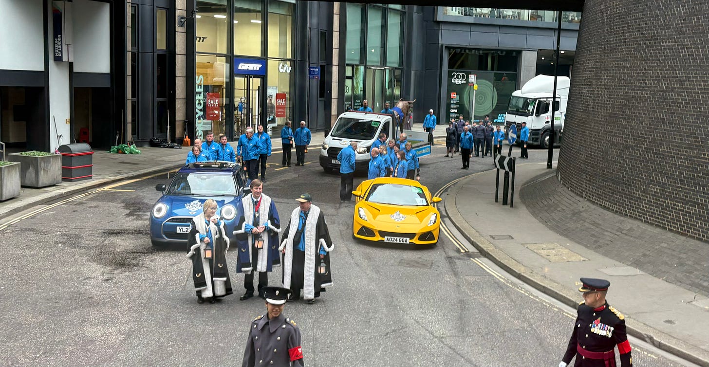 The Worshipful Company of Horners: Originally involved in crafting items from horn (like cups and combs), this guild has transformed over time to embrace the plastics industry, as many traditional horn-based products are now made from plastic. (We spotted the Horners on parade, see picture above.)